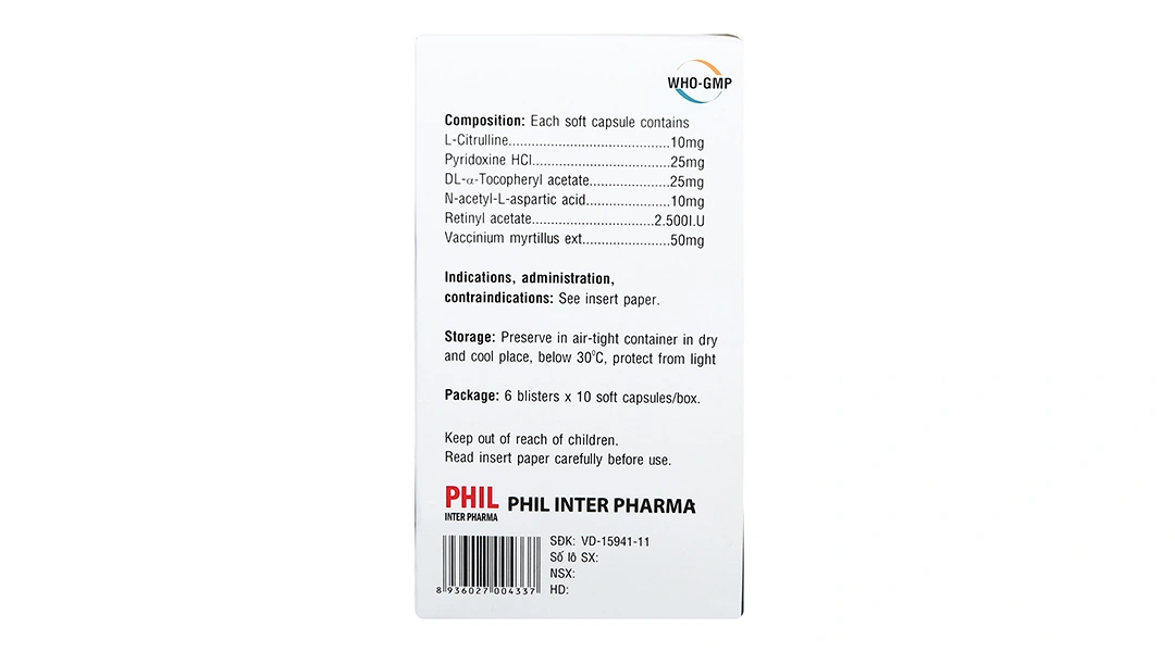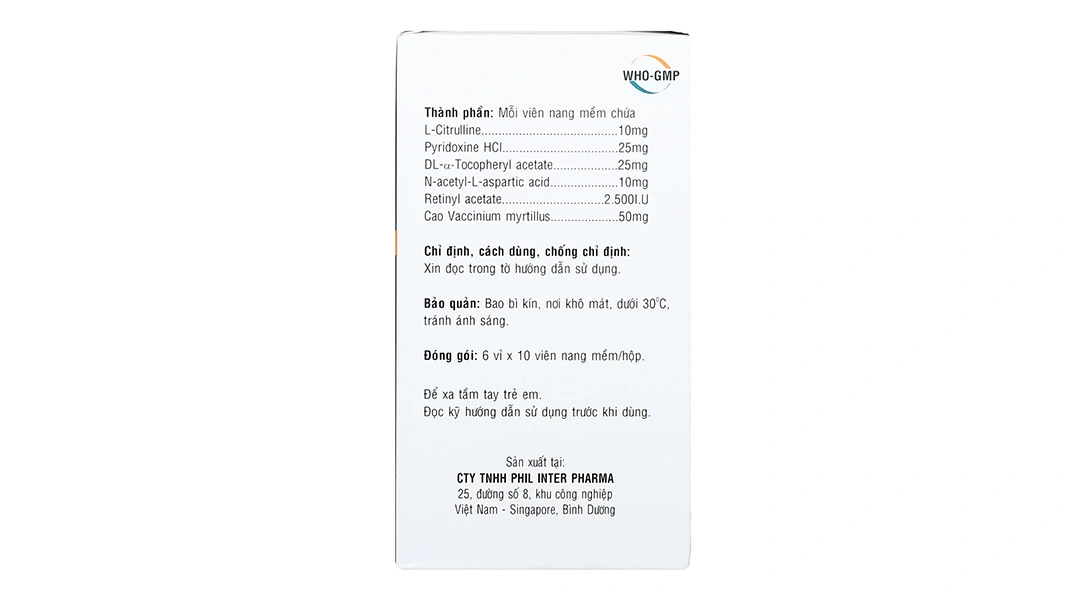 - L-Citrulline: 10 mg – Tiền chất của L-Arginine, hỗ trợ giãn mạch và tăng lưu thông máu đến mắt.