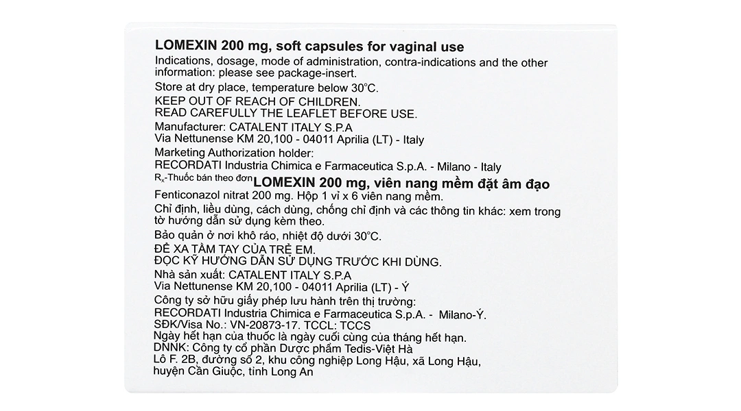 Thuốc Lomexin 200mg là viên nang mềm đặt âm đạo (vaginal soft capsule/ovule), chứa hoạt chất chính Fenticonazole nitrate 200 mg. Đây là dẫn xuất của imidazole, thuộc nhóm thuốc kháng nấm và kháng khuẩn phổ rộng. Thuốc được sản xuất bởi Catalent Italy S.P.A (Italy) – công ty dược phẩm uy tín châu Âu chuyên về bào chế dạng nang mềm và viên đặt.