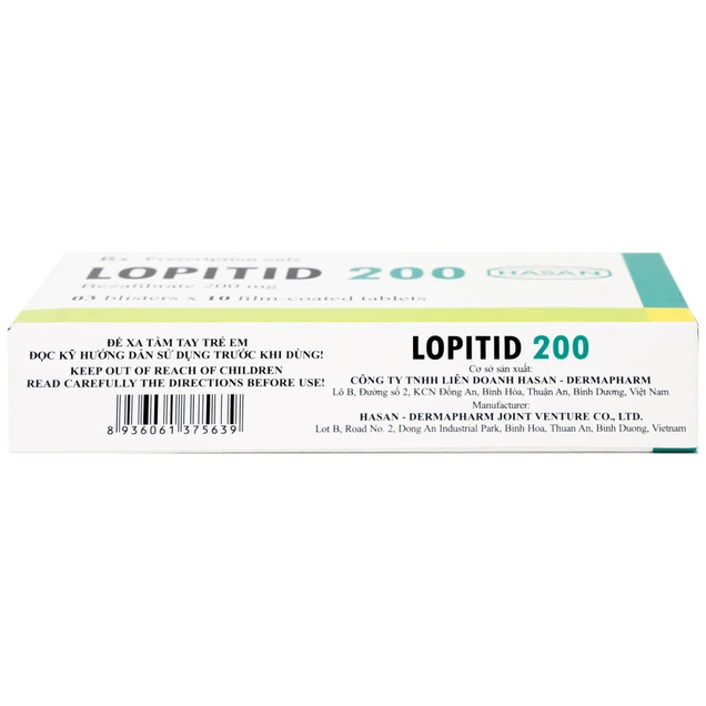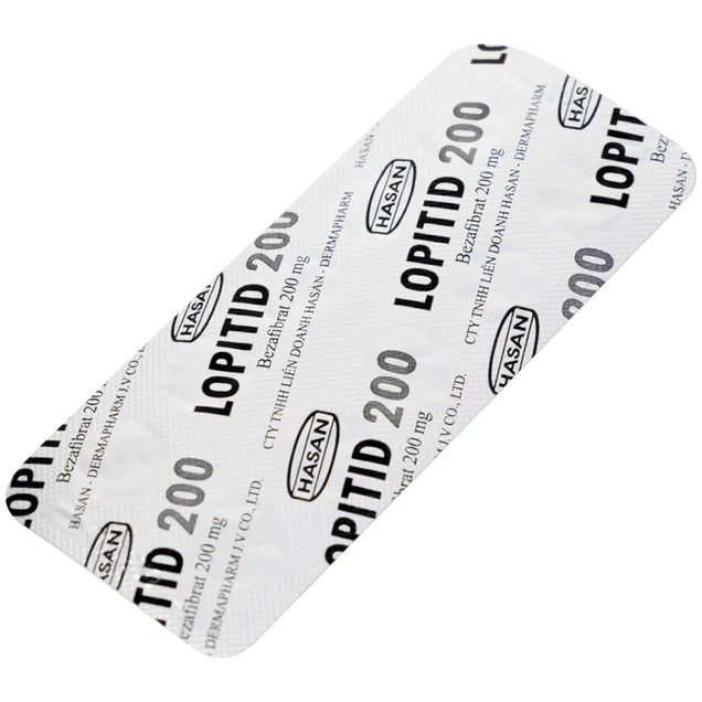 Lopitid 200 là thuốc hạ lipid máu đường uống, chứa hoạt chất chính là Bezafibrate 200mg, thuộc nhóm fibrat – một nhóm thuốc điều chỉnh lipid huyết thanh hiệu quả. Thuốc được sản xuất bởi Công ty TNHH Liên doanh HASAN – DERMAPHARM (Việt Nam), với số đăng ký VD-33907-19, đạt tiêu chuẩn GMP. Sản phẩm được bào chế dưới dạng viên nén bao phim, đóng gói hộp 3 vỉ x 10 viên, thuận tiện cho sử dụng hàng ngày và phù hợp với điều trị dài hạn.