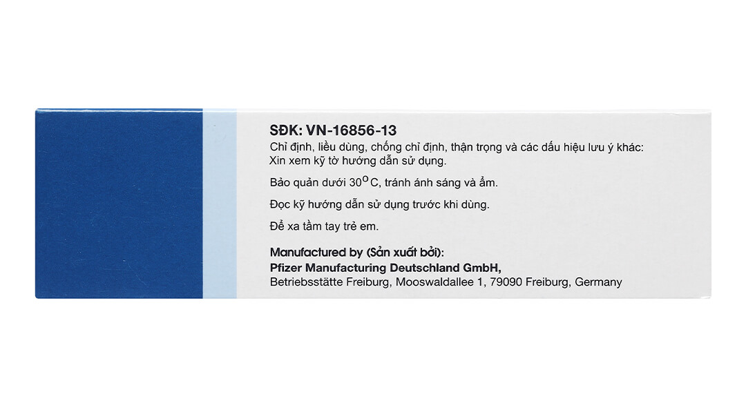 Thuốc được đóng gói trong vỉ 14 viên x 4 vỉ/hộp, tiện lợi cho việc sử dụng và bảo quản. Sản phẩm được sản xuất theo tiêu chuẩn GMP của Pfizer, đảm bảo chất lượng cao và an toàn.
