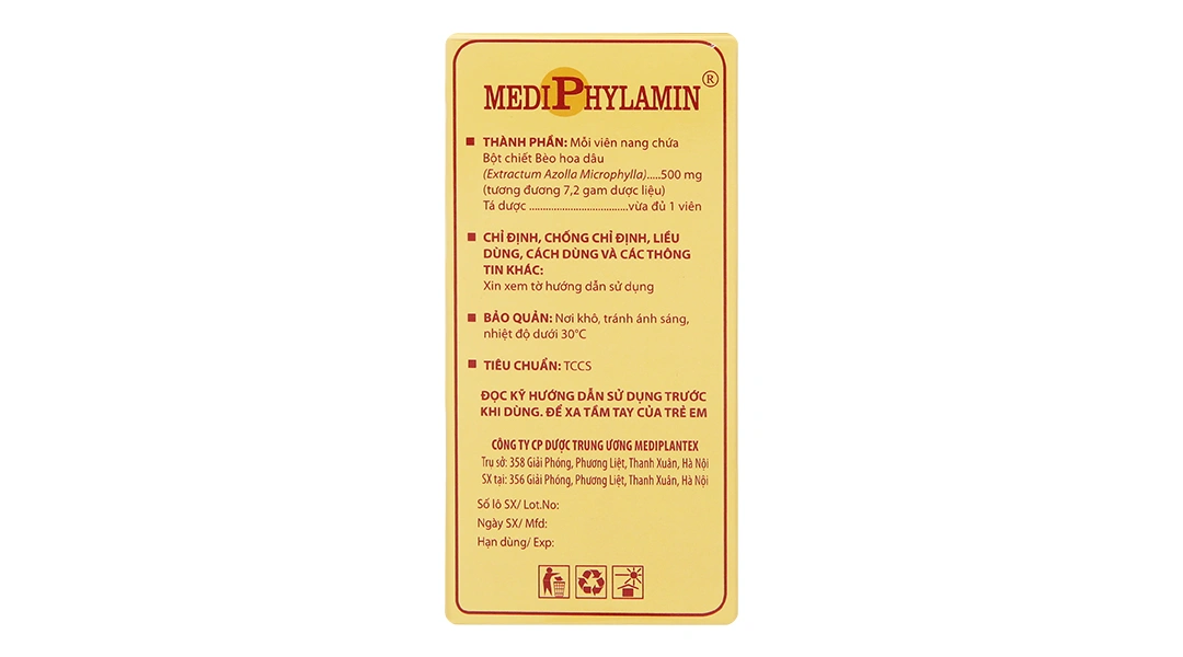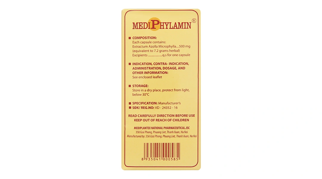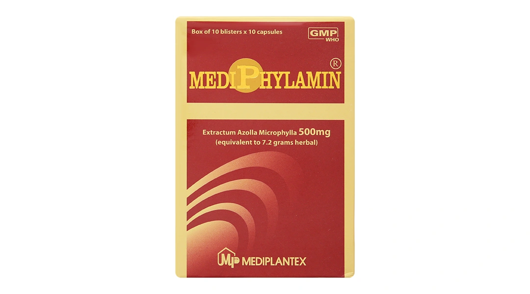 MediPhylamin 500mg là viên nang cứng chứa bột chiết xuất từ bèo hoa dâu, do Công ty Cổ phần Dược Trung ương Mediplantex – Việt Nam sản xuất. Sản phẩm được Bộ Y tế cấp số đăng ký lưu hành (VD-24352-16 hoặc tương đương), đạt tiêu chuẩn GMP-WHO.