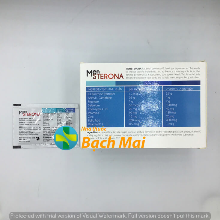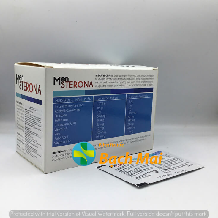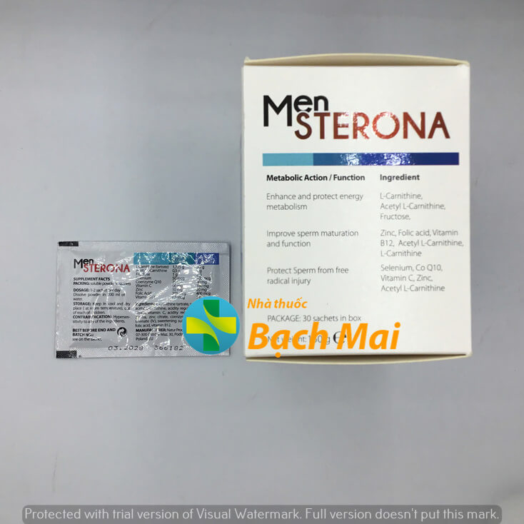 Mensterona không phải là thuốc chữa bệnh, mà là sản phẩm bổ sung dưỡng chất giúp hỗ trợ cải thiện chất lượng tinh trùng, tăng cường chức năng sinh lý nam và nâng cao khả năng thụ thai tự nhiên. Sản phẩm được bào chế dưới dạng bột hòa tan tiện dụng, mỗi hộp chứa 30 gói x 5g, dễ uống, không gây khó chịu cho dạ dày.