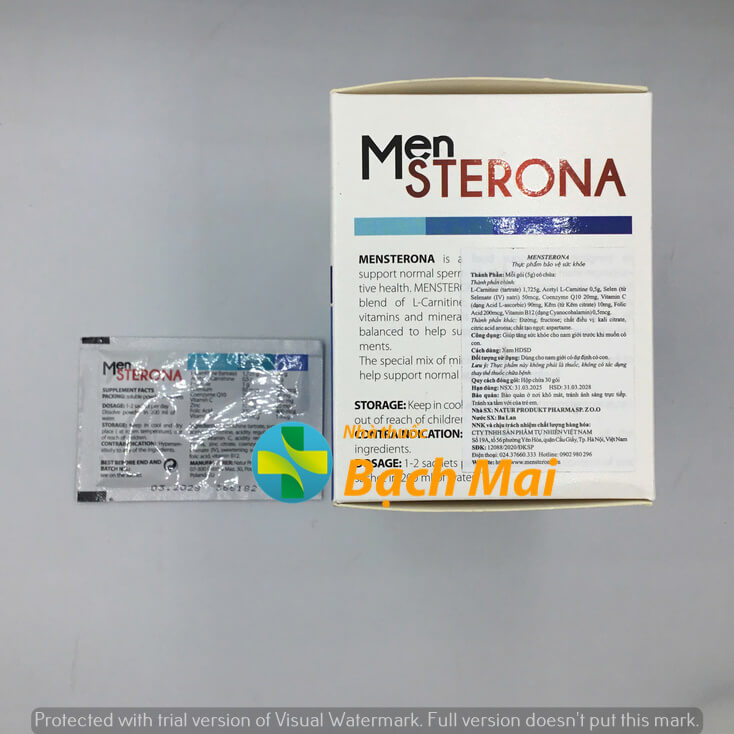 Mensterona là thực phẩm bảo vệ sức khỏe (thực phẩm chức năng) hỗ trợ sinh sản nam giới, được nghiên cứu và sản xuất bởi Natur Produkt Pharma Sp. z o.o. – công ty dược phẩm hàng đầu Ba Lan. Sản phẩm có số đăng ký 12088/2020/ĐKSP và được nhập khẩu chính ngạch vào Việt Nam bởi Công ty TNHH Sản Phẩm Tự Nhiên Việt Nam.