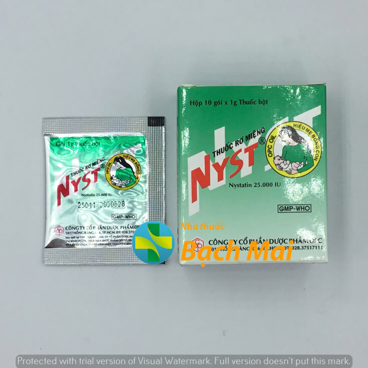 NYST 1g là thuốc bột dùng rơ miệng, đóng gói thành hộp 10 gói, mỗi gói 1g, dễ dàng mang theo và sử dụng tại nhà. Thuốc thuộc nhóm kháng nấm polyene, được chỉ định chủ yếu cho các trường hợp nấm miệng (đẹn), tưa miệng, viêm miệng, lưỡi mất nhú hoặc viêm họng do Candida albicans. Sản phẩm do OPC Pharma sản xuất từ năm 2017, tuân thủ tiêu chuẩn GMP-WHO, và được phân phối rộng rãi tại các nhà thuốc lớn như Nhà thuốc Bạch Mai.
