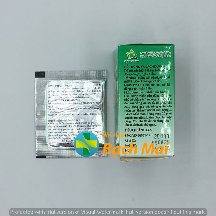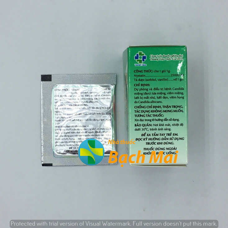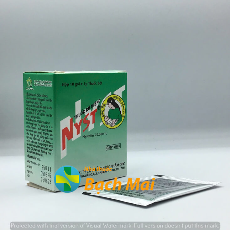 NYST 1g là thuốc bột dùng rơ miệng, đóng gói thành hộp 10 gói, mỗi gói 1g, dễ dàng mang theo và sử dụng tại nhà. Thuốc thuộc nhóm kháng nấm polyene, được chỉ định chủ yếu cho các trường hợp nấm miệng (đẹn), tưa miệng, viêm miệng, lưỡi mất nhú hoặc viêm họng do Candida albicans. Sản phẩm do OPC Pharma sản xuất từ năm 2017, tuân thủ tiêu chuẩn GMP-WHO, và được phân phối rộng rãi tại các nhà thuốc lớn như Nhà thuốc Bạch Mai.