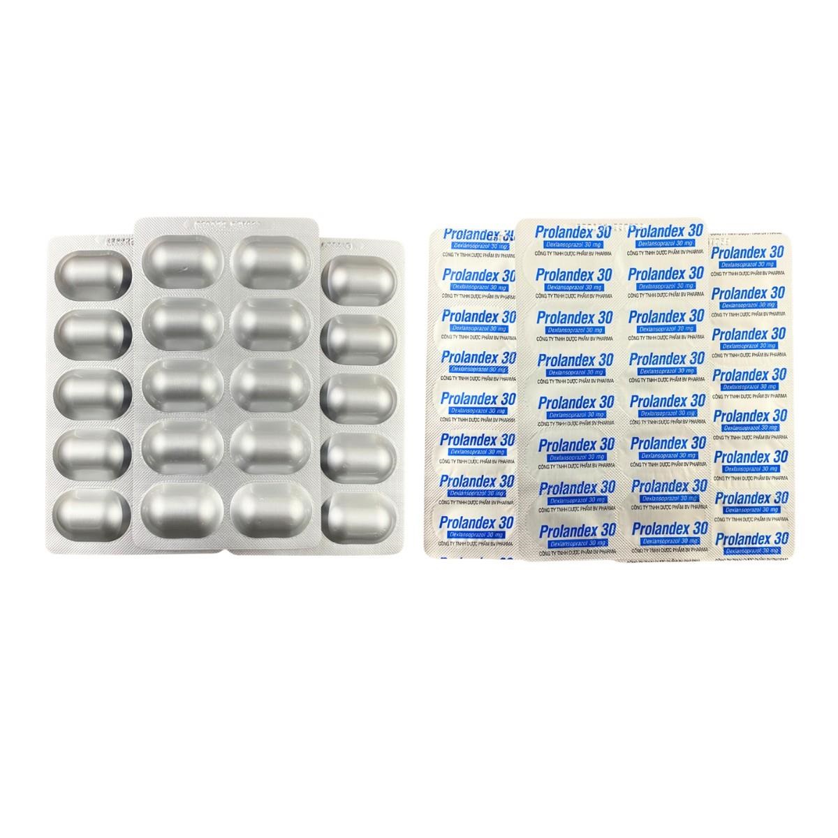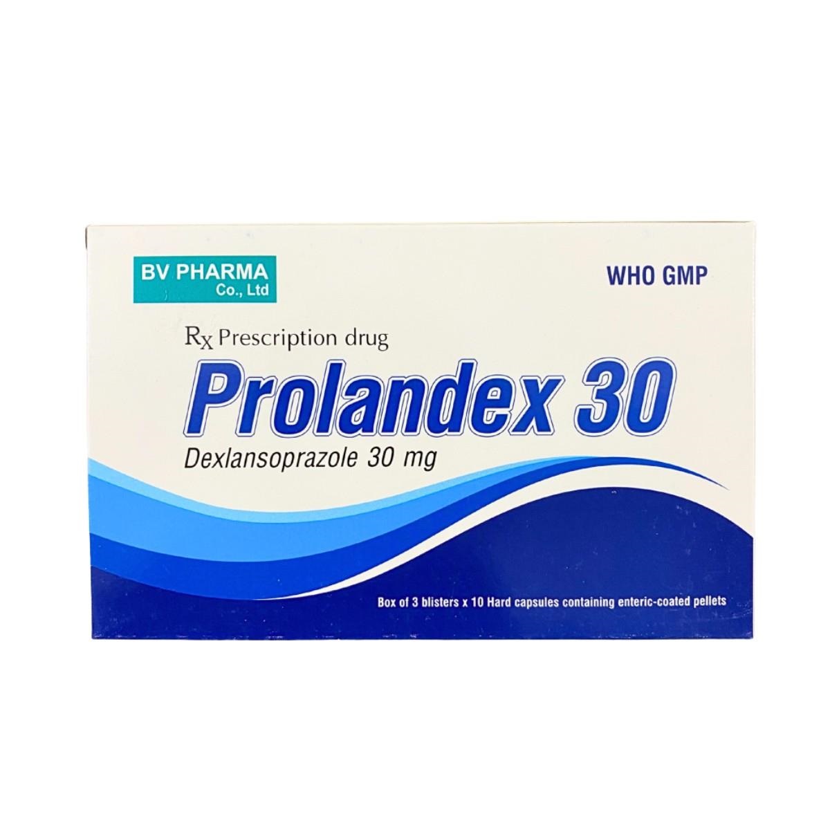 Prolandex 30 là thuốc biệt dược chứa hoạt chất Dexlansoprazole 30mg, thuộc nhóm ức chế bơm proton (PPI) thế hệ mới. Thuốc được sản xuất bởi Công ty TNHH Dược phẩm BV Pharma (Việt Nam), dạng viên nang cứng chứa vi hạt bao tan trong ruột với cơ chế phóng thích kép (dual release): một phần giải phóng ngay lập tức, phần còn lại giải phóng chậm, giúp duy trì pH dạ dày ổn định lâu hơn so với các PPI thông thường.