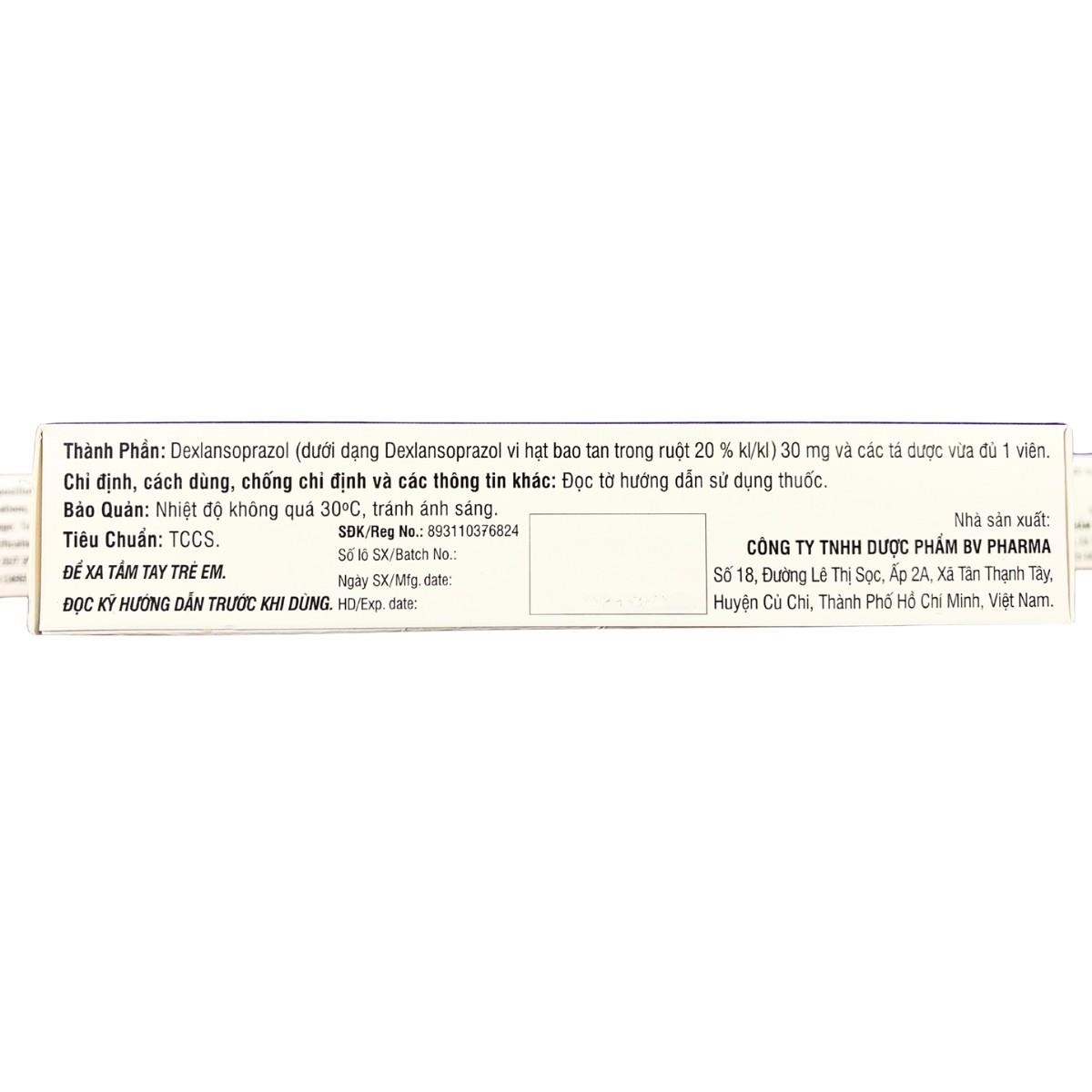 - Hoạt chất chính: Dexlansoprazole 30mg (dưới dạng vi hạt Dexlansoprazole bao tan trong ruột 20% w/w).