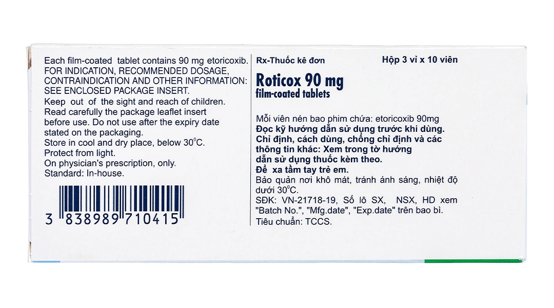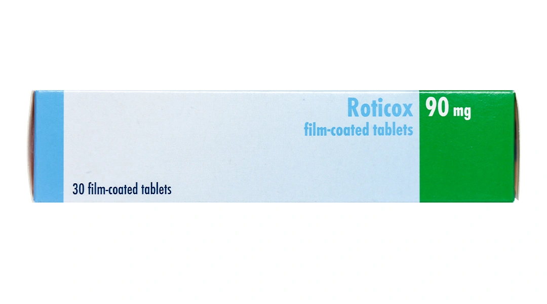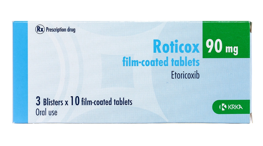 Roticox 90mg (tên đầy đủ: Roticox 90 mg film-coated tablets) là viên nén bao phim chứa Etoricoxib 90mg, được sản xuất bởi KRKA, d.d., Novo Mesto – một trong những công ty dược phẩm hàng đầu Slovenia. Thuốc được đăng ký lưu hành tại Việt Nam với số đăng ký VN-21717-19 (hoặc tương đương tùy lô), thuộc nhóm thuốc kê đơn.