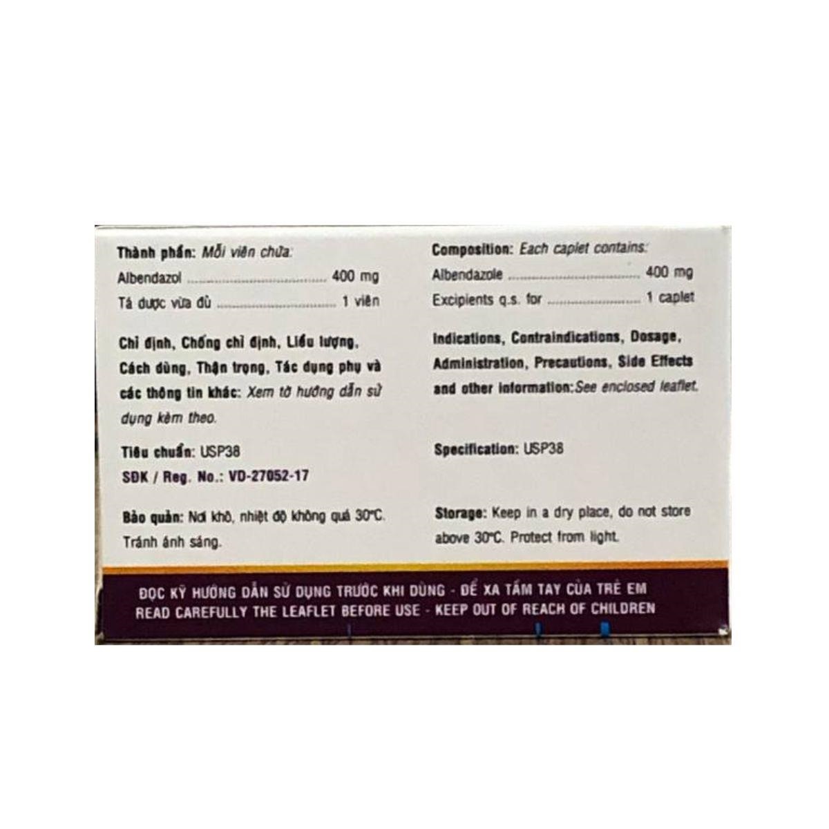 Mỗi viên chứa Albendazol 400mg – hoạt chất chống giun sán phổ rộng, hiệu quả cao trong việc diệt cả giun trưởng thành, ấu trùng và trứng. Thuốc đóng gói phổ biến: hộp 1 vỉ x 1 viên (hoặc 1 vỉ x 2 viên tùy dạng), dạng viên nén bao phim dễ uống.