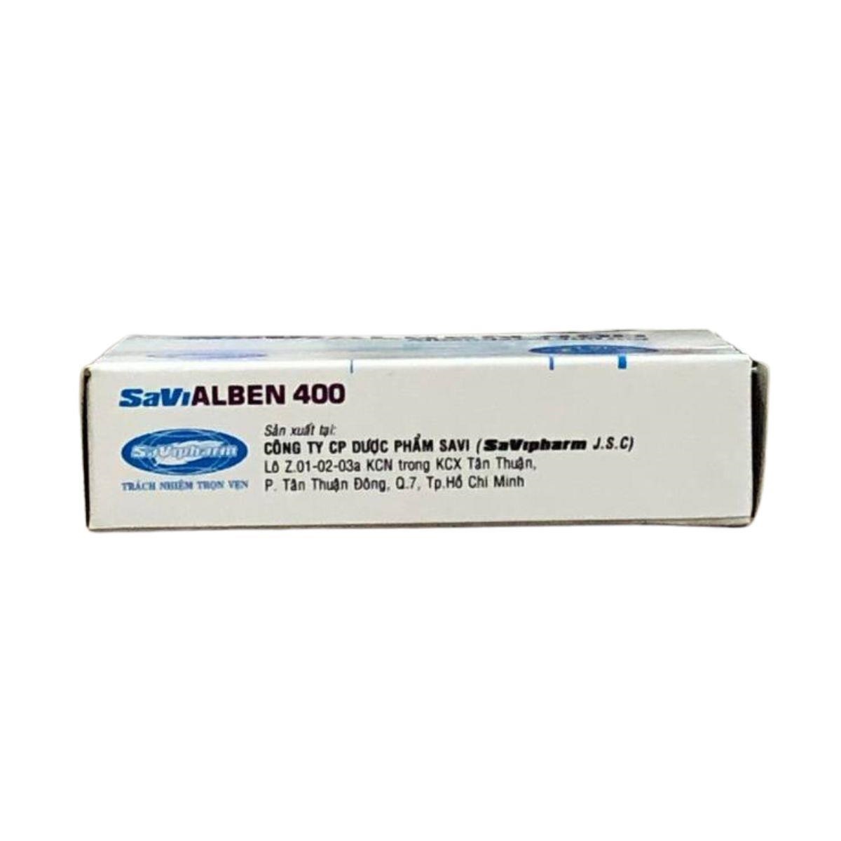 Savi Alben 400 (tên đầy đủ: SaViAlben 400 viên nén bao phim) là thuốc điều trị ký sinh trùng đường ruột do Công ty Cổ phần Dược phẩm SaVi sản xuất tại Việt Nam. Thuốc được đăng ký lưu hành với số VD-27052-17 (hoặc tương đương tùy lô), thuộc nhóm thuốc kê đơn hoặc không kê đơn tùy chỉ định.