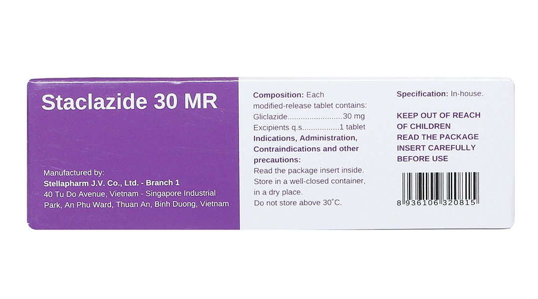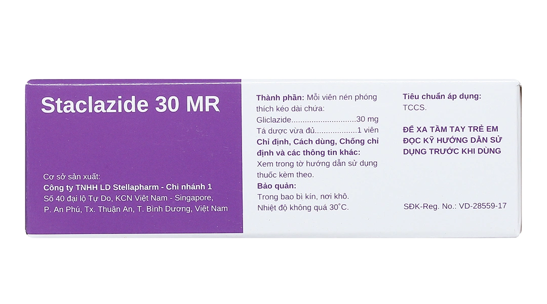 Staclazide 30 MR là thuốc kê đơn dạng viên nén phóng thích có kiểm soát (modified release), được sản xuất bởi Công ty TNHH Liên doanh Stellapharm (liên doanh Việt Nam – Singapore). Sản phẩm có số đăng ký phổ biến như 893110338623, thuộc nhóm thuốc chống đái tháo đường đường uống.