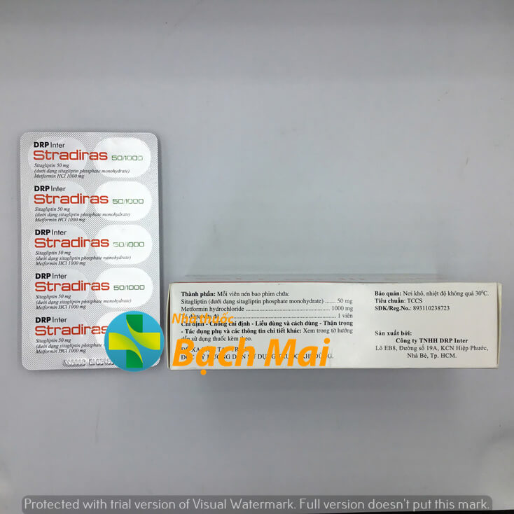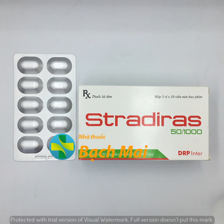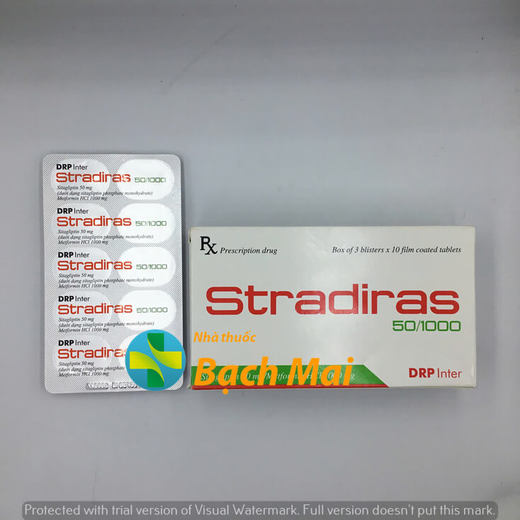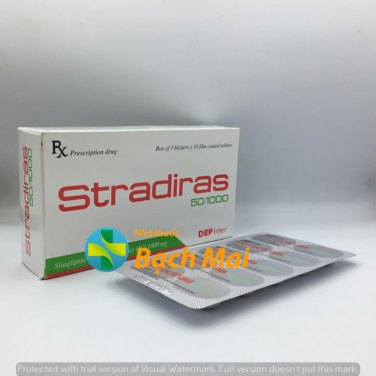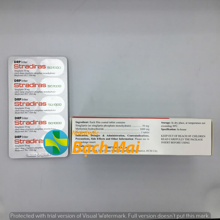 Stradiras 50/1000 là thuốc viên nén bao phim, chứa hai hoạt chất chính: Sitagliptin 50mg (thuộc nhóm ức chế DPP-4) và Metformin 1000mg (thuộc nhóm biguanide). Thuốc được sản xuất bởi DRP Inter, được chỉ định như một liệu pháp bổ trợ cho chế độ ăn kiêng và tập luyện để kiểm soát đường huyết ở người lớn mắc đái tháo đường tuýp 2 khi liệu pháp đơn trị liệu không đạt hiệu quả. Stradiras 50/1000 được Cục Quản lý Dược Việt Nam phê duyệt và phân phối rộng rãi tại các nhà thuốc uy tín.